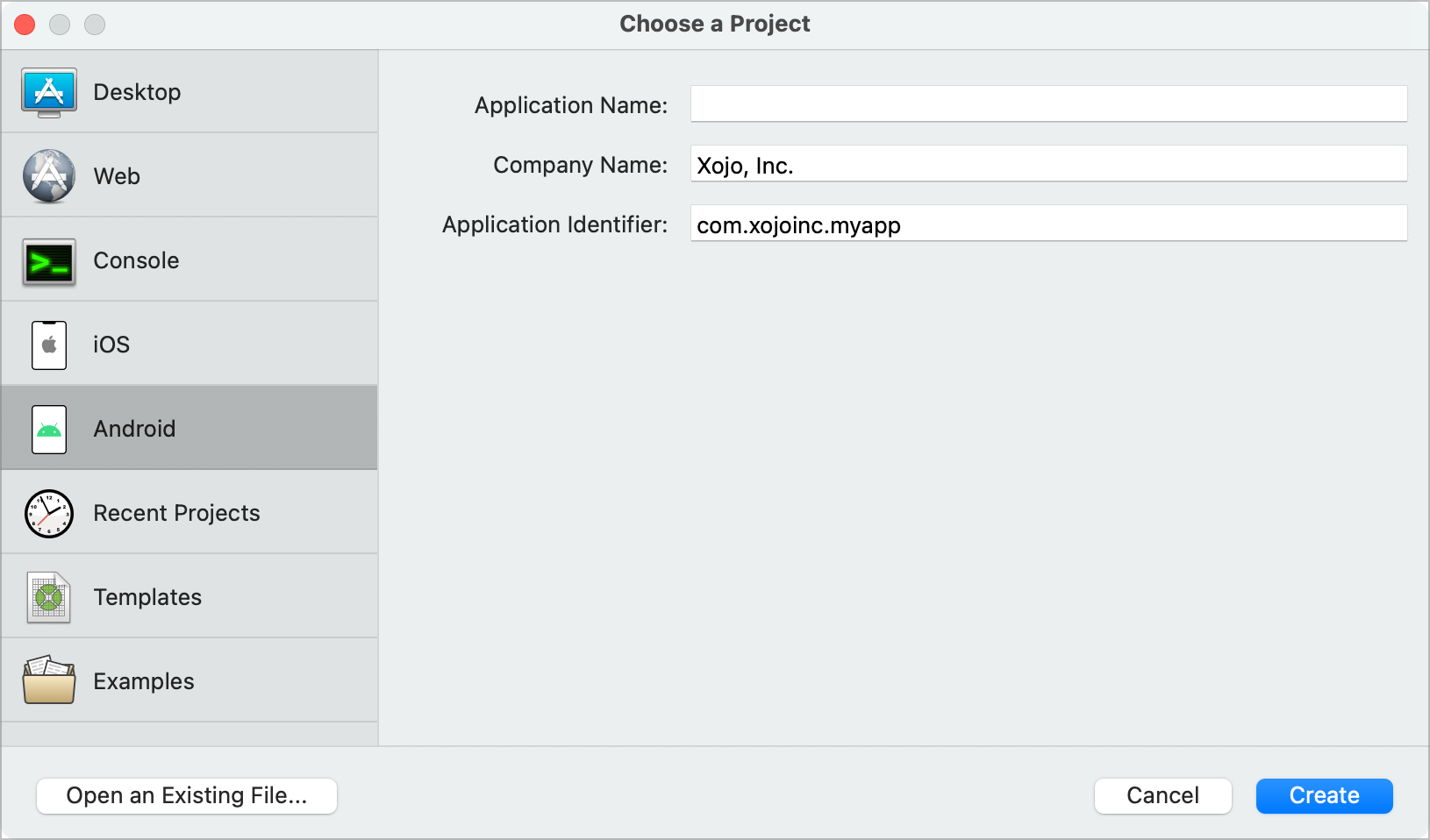 SimpleBrowseras the Application Name.Click Create to open the Workspace, the main Xojo window, where you will begin designing your app.
