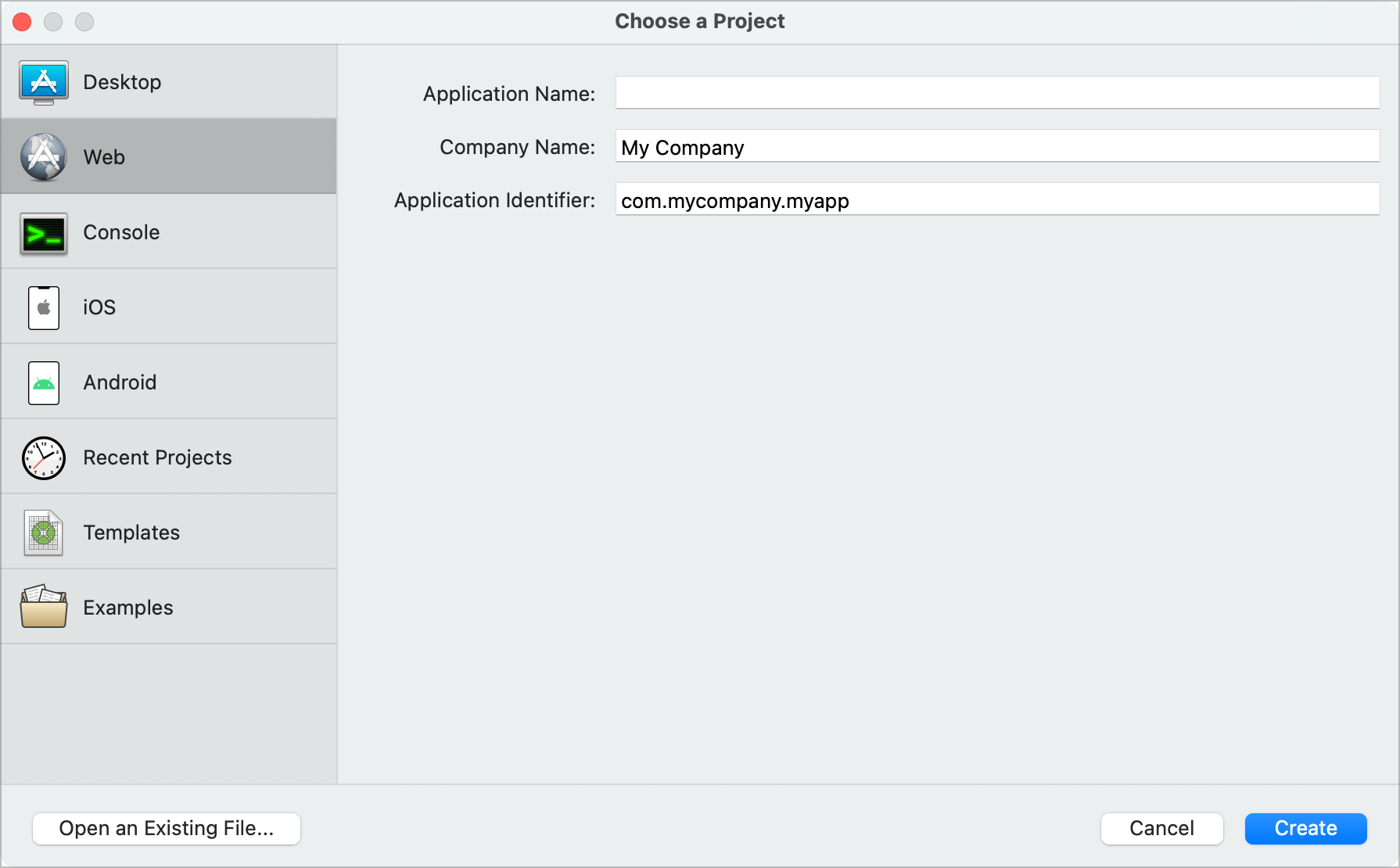 Xojo lets you build several different types of apps (Desktop, Web, Console and iOS). For this QuickStart, you are building a Web app, so click on Web.