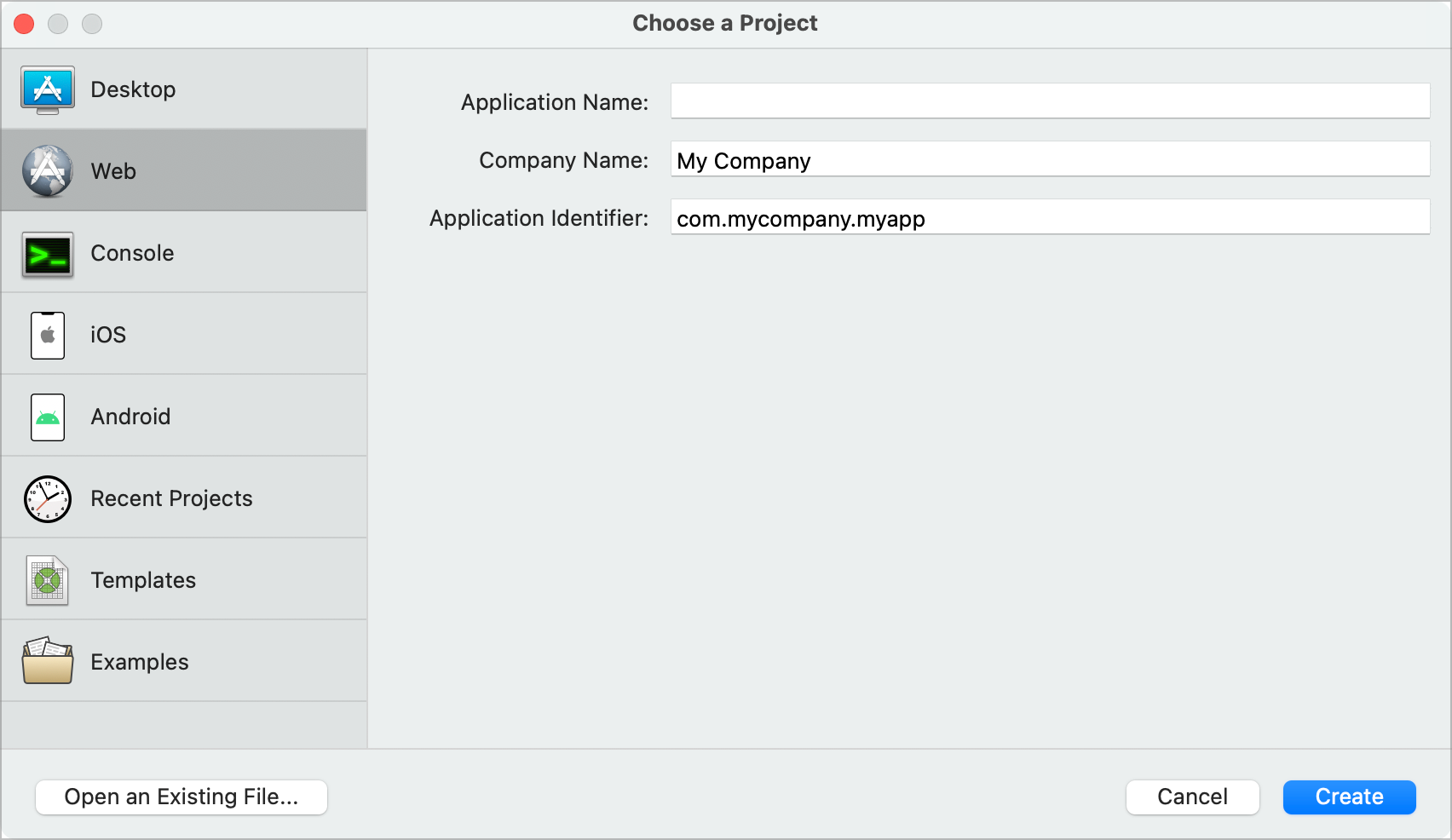 Xojo lets you build several different types of apps (Desktop, Web, Console, iOS and Android). For this Tutorial, you are building a web app, so click on Web. You should now see three fields that need values: Application Name, Company Name and Application Identifier.
