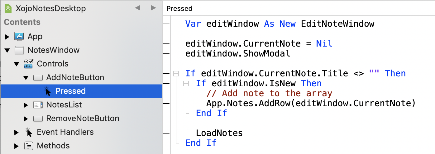 Your app is eventually going to need code, which you write using the Xojo programming language in the built-in Code Editor. Code can be attached to almost any item that is in your project, including windows, web pages, controls, classes, modules and more.