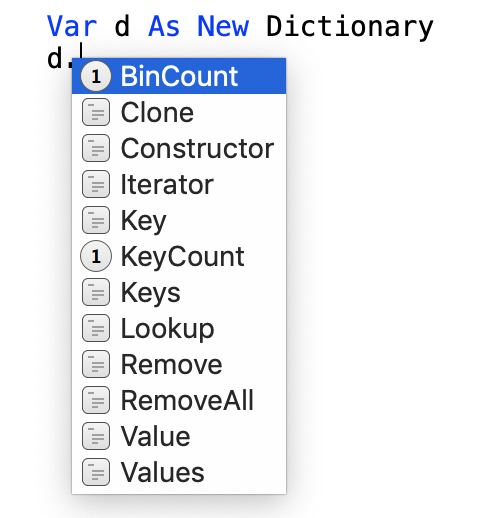 When the auto-complete list is displayed, you can choose the item you want using the mouse or you can continue typing to automatically move the selection in the list. When you've reached the selection you want, just press return. Here, "d." was typed and when the tab key was pressed the auto-complete menu appeared showing the methods and properties of a Dictionary that are relevant: