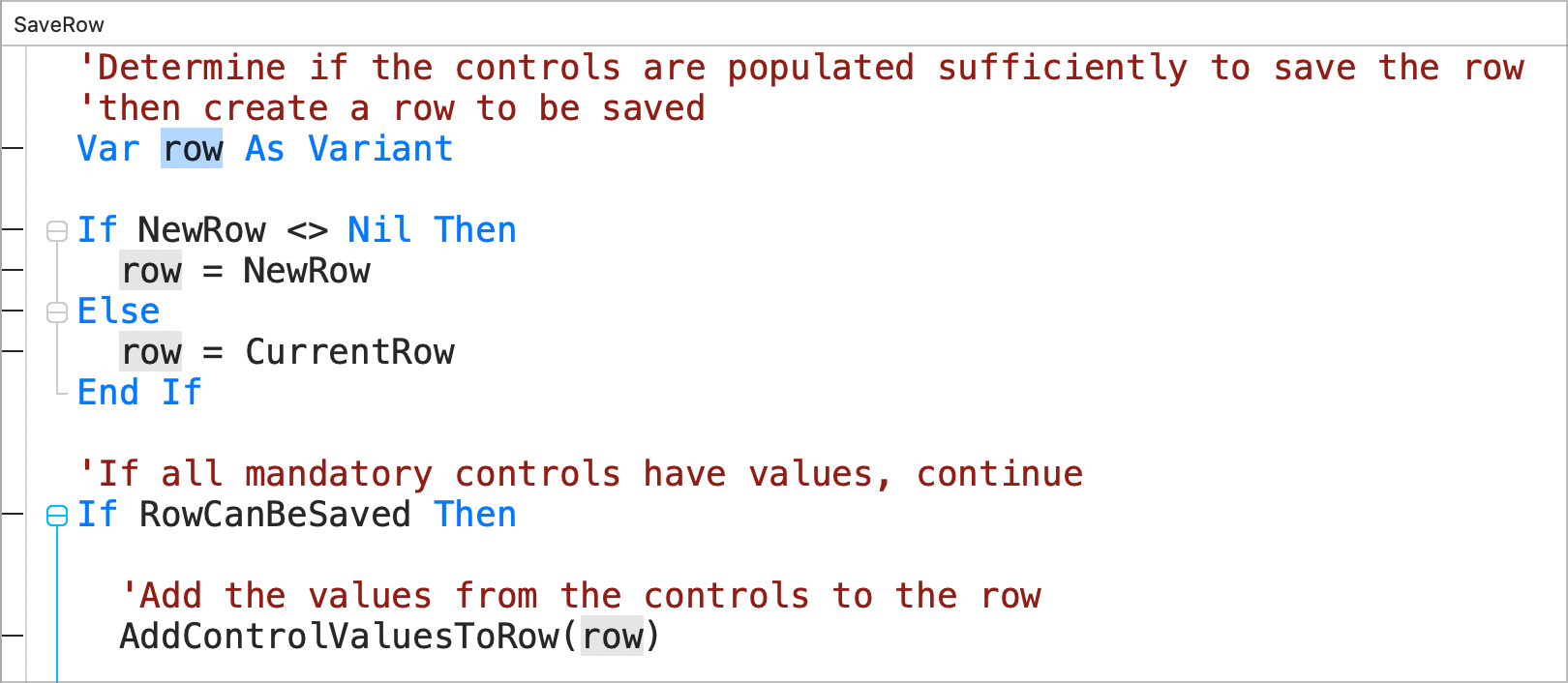 The Code Editor automatically indents your code as you type it. Code such as If...Then, While/Do loops, Select...Case and other commands that group code are indented for you automatically. Code that is indented is referred to as a code block. In the Code Editor, you can see that code blocks have a small “-” sign to their left. When you hover over the "-", the code block lines are highlighted to better identify the code block.