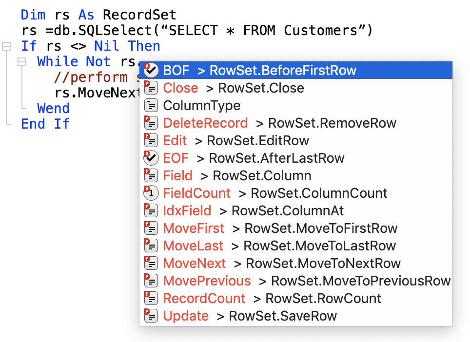 In addition to built-in functions above, you can also add your own code assistants. This is done using XojoScript. If you haven't used XojoScript before, don't panic. It's the Xojo language but without access to framework functions. You write your code assistants using the IDE Script editor.