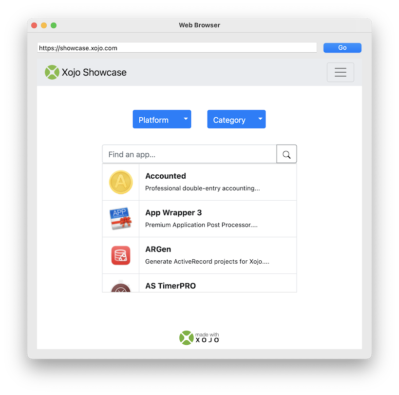 Prueba otra URL. En esta ocasión, introduce https://showcase.xojo.com`.