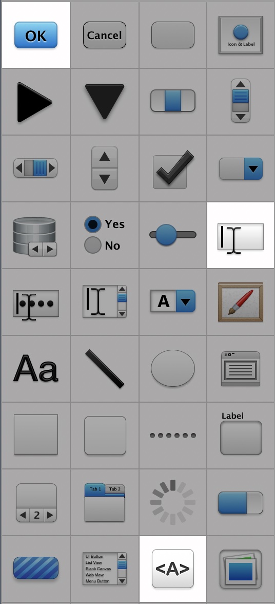 Inspector: No mostrado en la anterior ilustración se encuentra el Inspector, y cuya función es la de permitirte ver y cambiar las propiedades para el control seleccionado. Este área de la ventana principal es compartida con la Librería. Puedes mostrar el Inspector haciendo clic en el botón Inspector de la barra de herramientas. El Inspector muestra la información sobre el elemento seleccionado en el Navegador o en el Editor. Los contenidos del Inspector cambian a medida que hagas clic sobre diferentes elementos. Puedes cambiar un valor en el Inspector introduciendo uno nuevo en el campo situado a la derecha de la etiqueta.