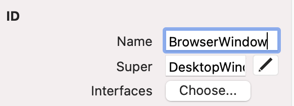 En el campo Name (ubicado en el grupo ID), cambia el name de Window1 a BrowserWindow`. Pulsa RETURN para ver el cambio de nombre en el Navegador.