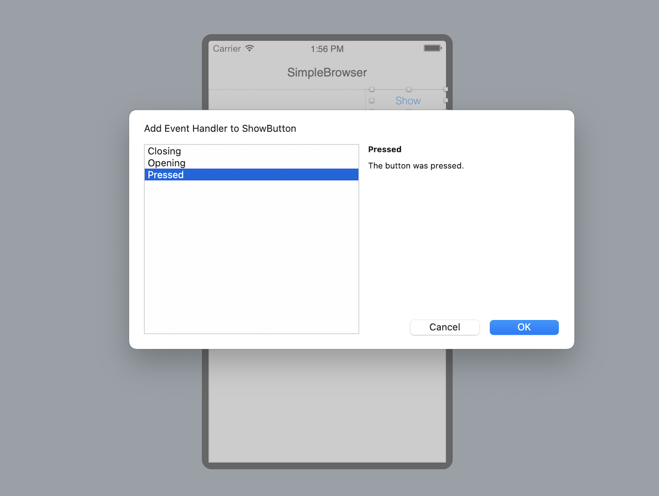 Aparecerá el diálogo correspondiente a Add Event Handler. Los Event Handler (Manejadores de Evento) tienen lugar cuando el usuario inicia una acción. En este caso, cuando el usuario pulse sobre el botón la app ejecutará cualquier código que se encuentre en su manejador de evento Pressed. Selecciona Pressed de entre las opciones mostradas en el listado de Event Handler y haz clic en OK. Observa cómo se actualiza el Navegador para mostrar el evento Pressed bajo el control ShowButton, además de que muestra el Editor de Código asociado.