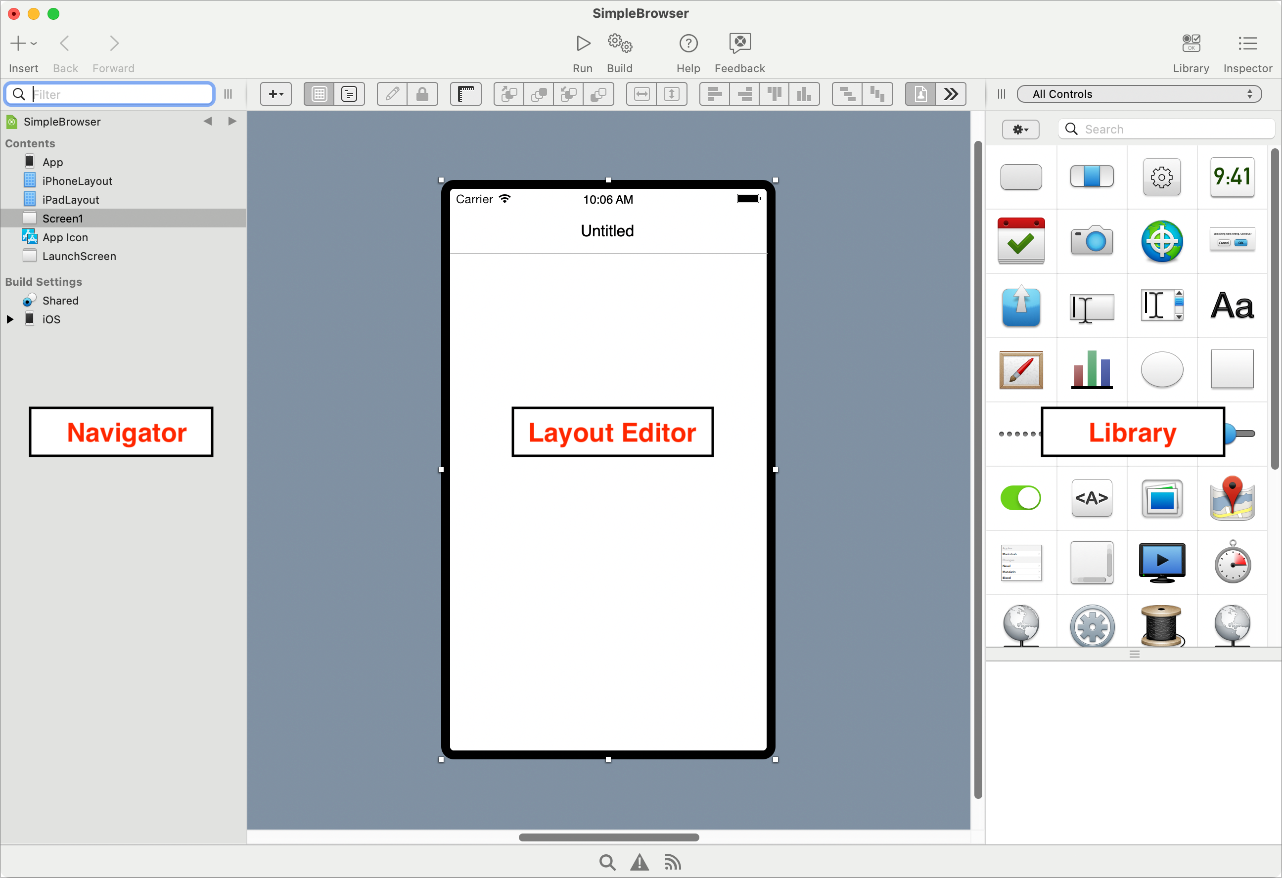 Una app Xojo está conformada por una colección de objetos, denominados clases. Prácticamente todo en Xojo es una clase, incluyendo las pantallas y los controles. En este proyecto SimpleBrowser utilizas una clase por defecto Screen para crear tu pantalla, y añades controles (clases de interfaz de usuario) a la pantalla para crear su diseño.
