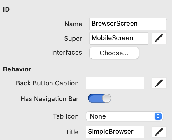 En el campo Name (situado en el grupo ID), cambia el name de Screen1 a `BrowserScreen. Pulsa RETURN para ver el nombre cambiado en el Navegador.
