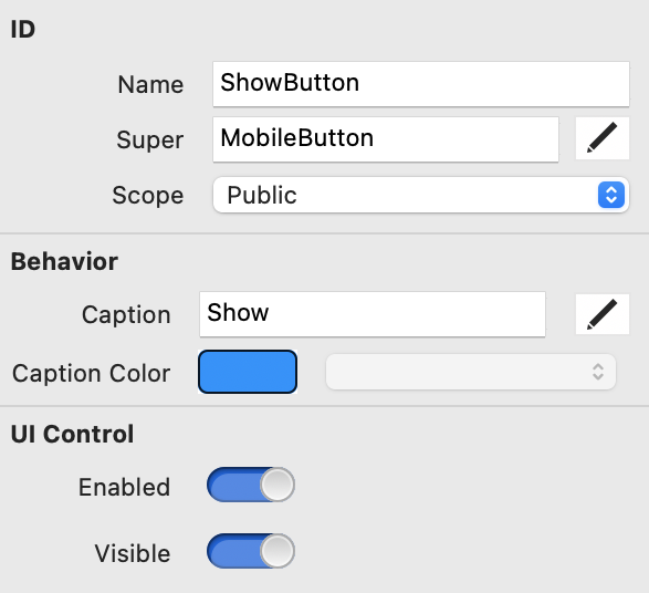 Proporciona una etiqueta al botón, cambiando el campo Caption de `Button a Show`.