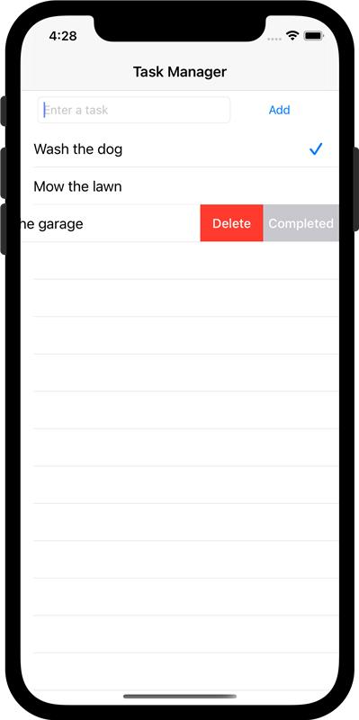 Para la app Task Manager introducirás tareas en un campo de texto y harás tap sobre Add para añadirlas a la tabla. Puedes hacer tap sobre cada tarea en la tabla para borrarla o bien marcarla como completada.