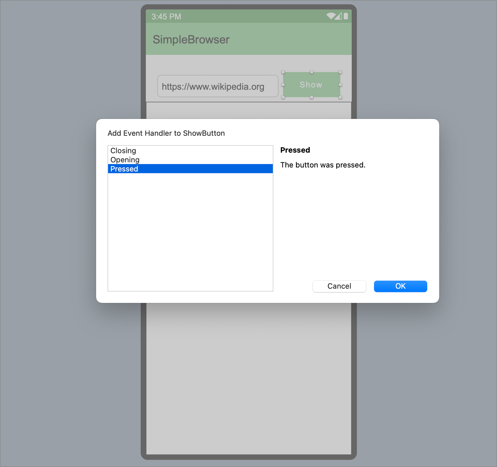 The Add Event Handler window appears. Event Handlers occur when the user initiates an action. In this case, when a user presses on a Button, your app runs any code in its Pressed event handler. Select Pressed from the Event Handler list and click OK. Notice the Navigator updates to show the Pressed event underneath the ShowButton control and the Code Editor displays.