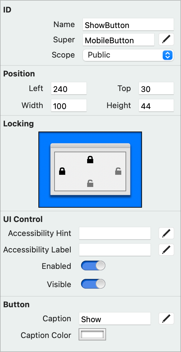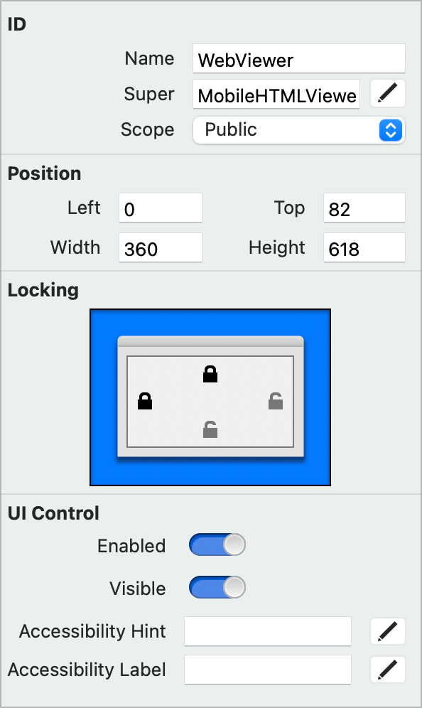 HTMLViewer1toWebViewer.Finally, you need to make changes to the locking so that the HTML Viewer continues to fill the screen not matter its size. Click the locks so that top, bottom, left and right are locked.