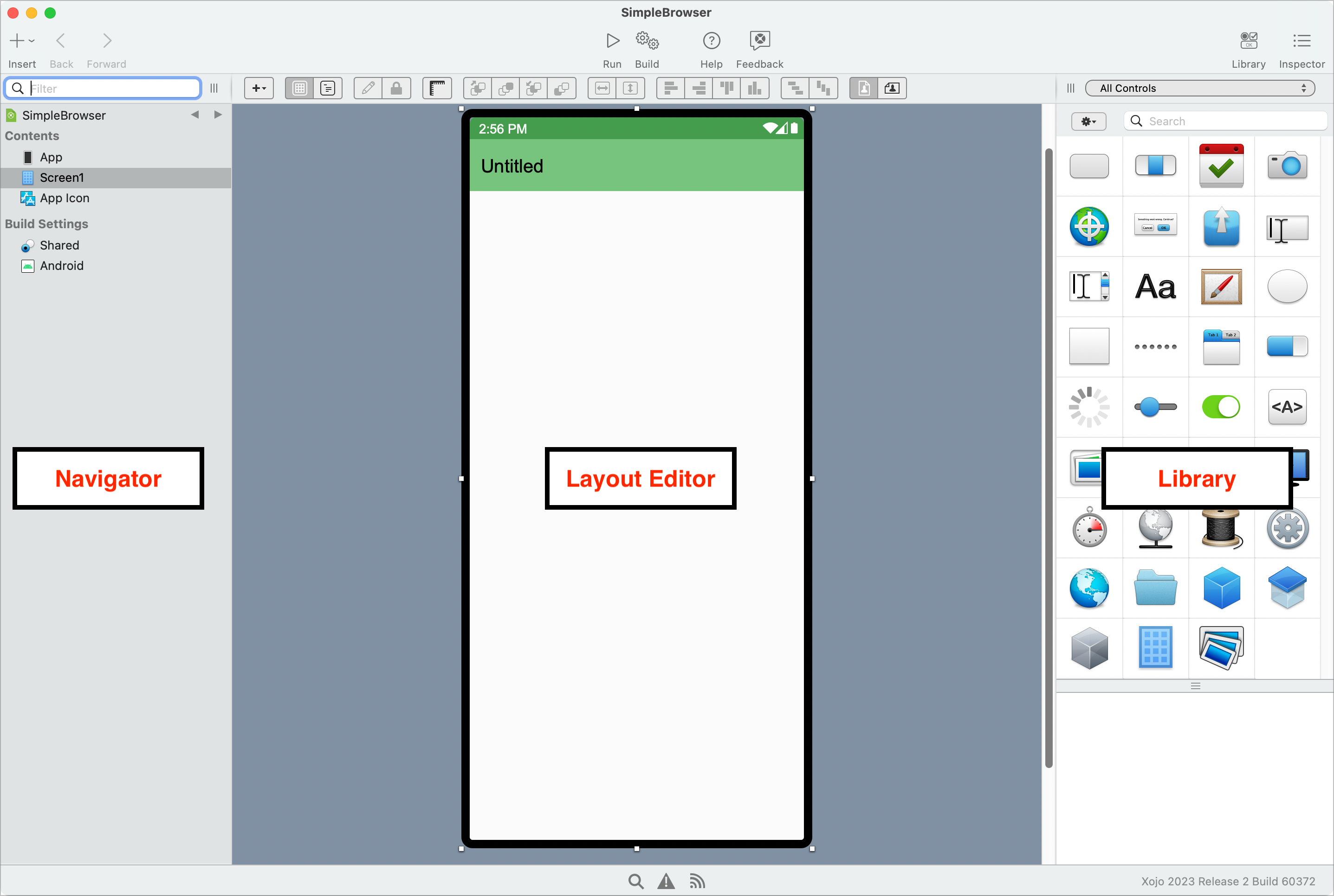 A Xojo app consists of a collection of objects, called classes. Nearly everything in Xojo is a class, including screens and controls. In the SimpleBrowser project, you use the default Screen class to create your screen and you add controls (user interface classes) to the screen to create the design.
