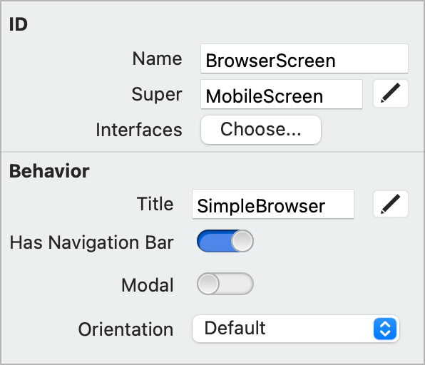 Screen1toBrowserScreen. Press RETURN to see the name change in the Navigator.In the Title field, change the name to