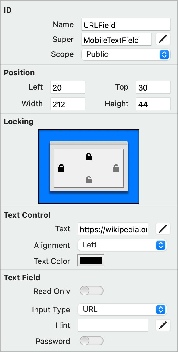 TextField1toURLField.Now make changes to the locking so that the Text Field fills the space based upon the size of the screen. Click the locks so that top, left and right are locked and bottom is unlocked.
