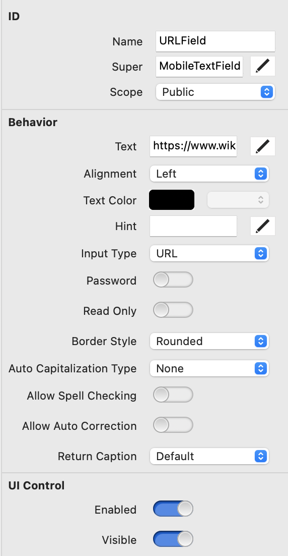 TextField1toURLField.In the InputType field, select URL from the popup menu. This displays the special URL keyboard on the iOS device when the user taps in the field.