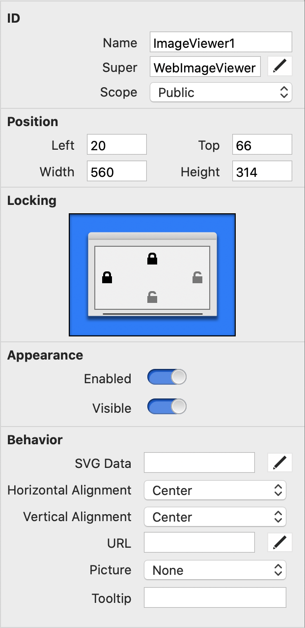 In the Inspector notice that the Locking section shows four locks. The top and left are already locked indicating that the ImageViewer's top and left sides are locked by default.