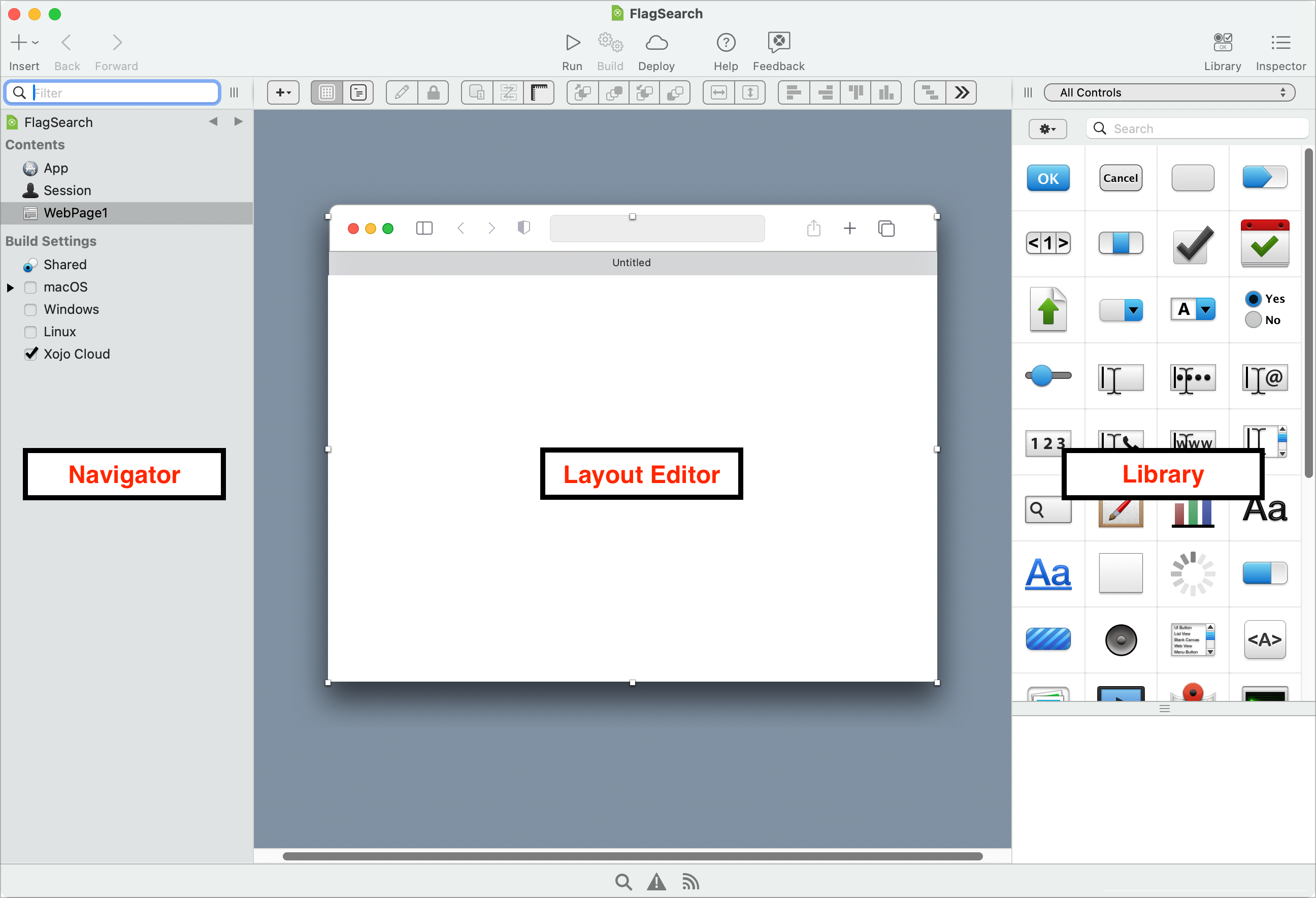 A Xojo app consists of a collection of objects, called classes. Nearly everything in Xojo is a class, including your web pages and the controls on the web page. In the Flag Search project, you will use the default WebPage class to create your web page and you will add controls (user interface classes) to the web page to create the design.