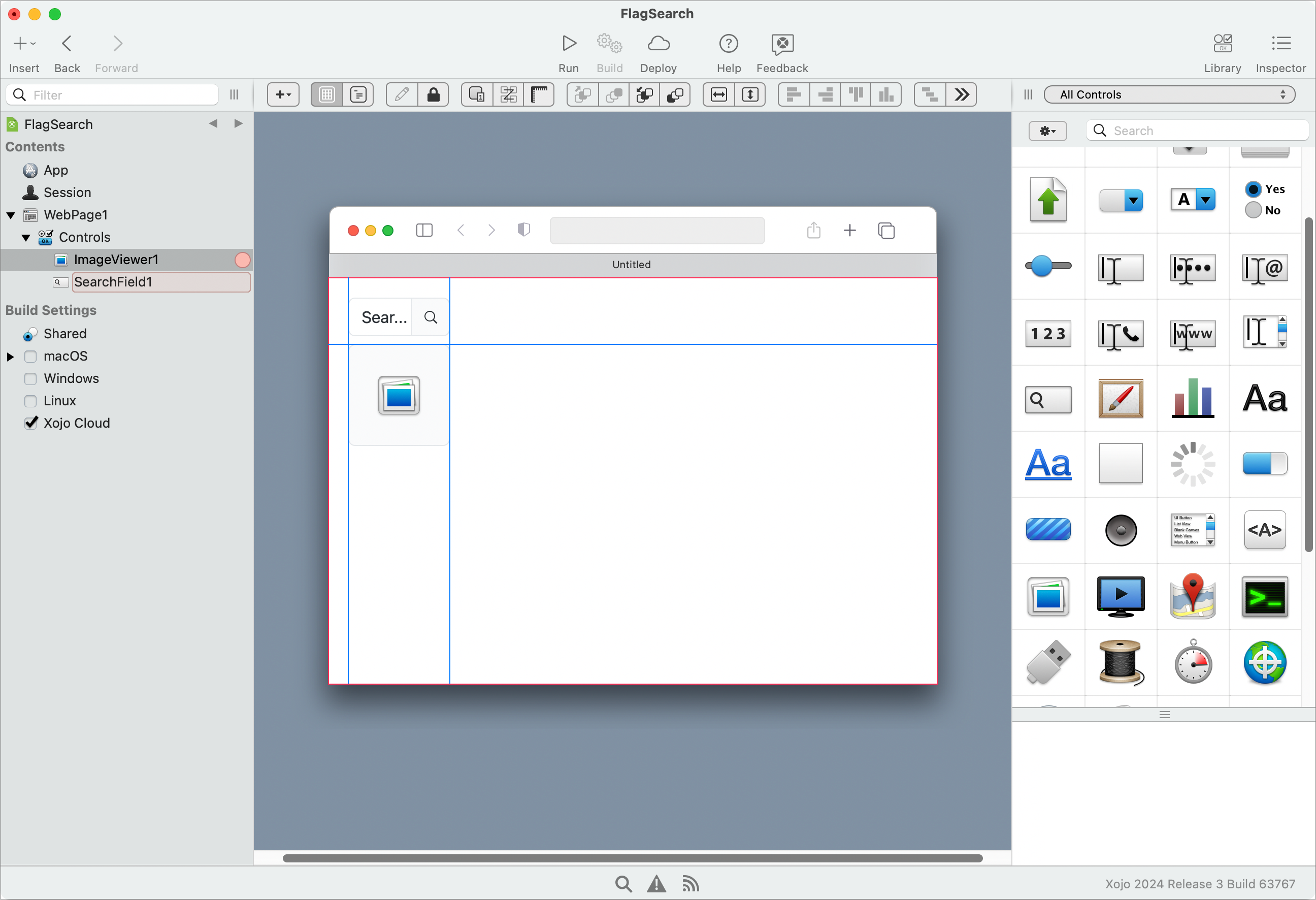 WebPage1 is now open in the Layout Editor. It's time to start adding controls to the web page. You will add a SearchField and an ImageViewer to your webpage by dragging it from the Library on the right side of the Workspace and dropping them on your webpage.