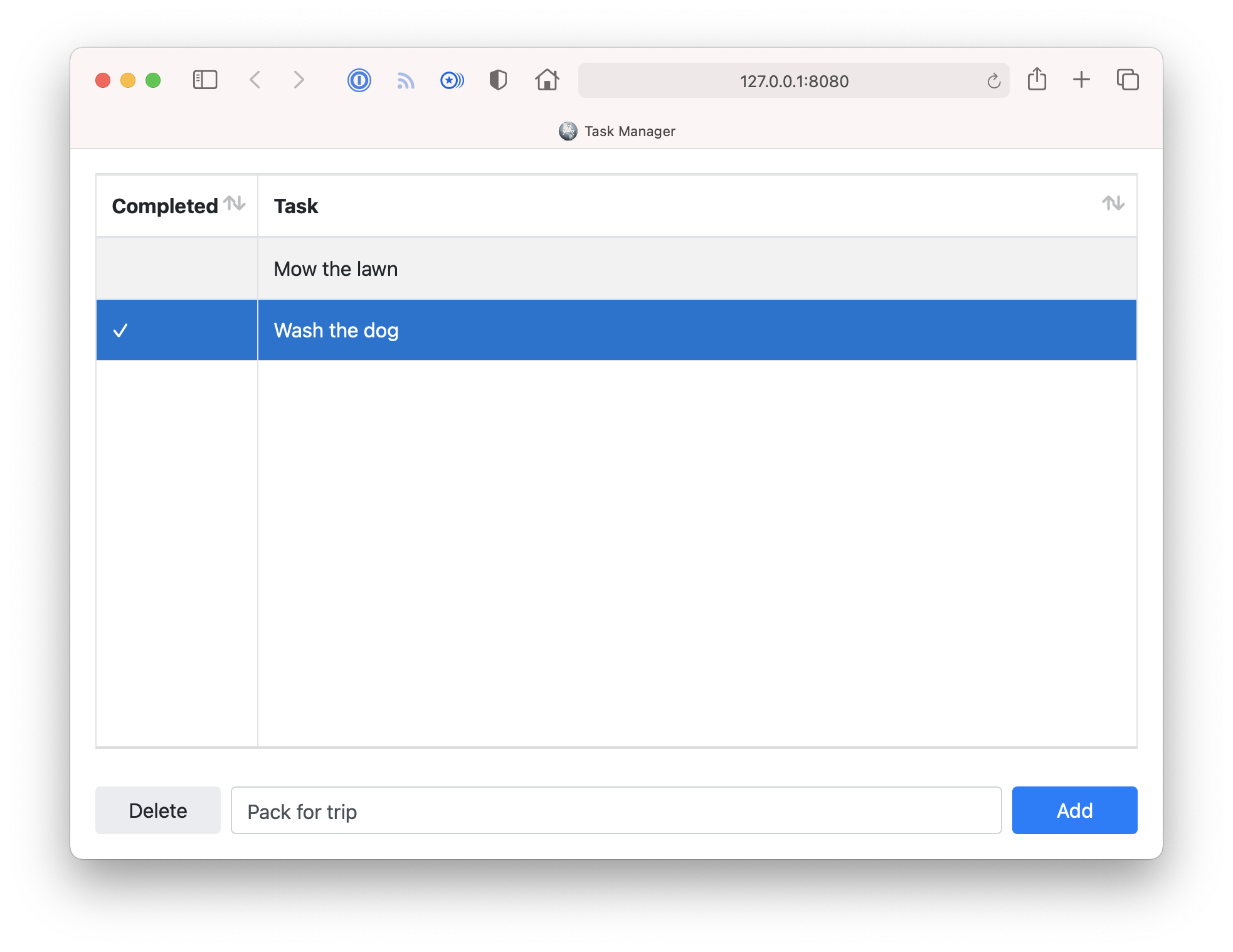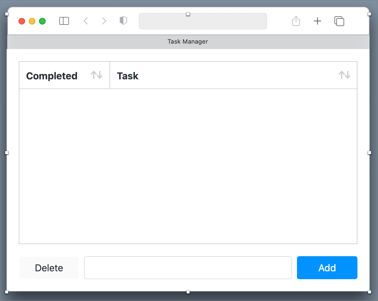 In this tutorial you will create an app to track tasks, called Task Manager. When finished, the Task Manager app will let you enter tasks in a field then click the Add button to add them to the Task list. You can click on individual tasks in the list to delete them or mark them as complete.