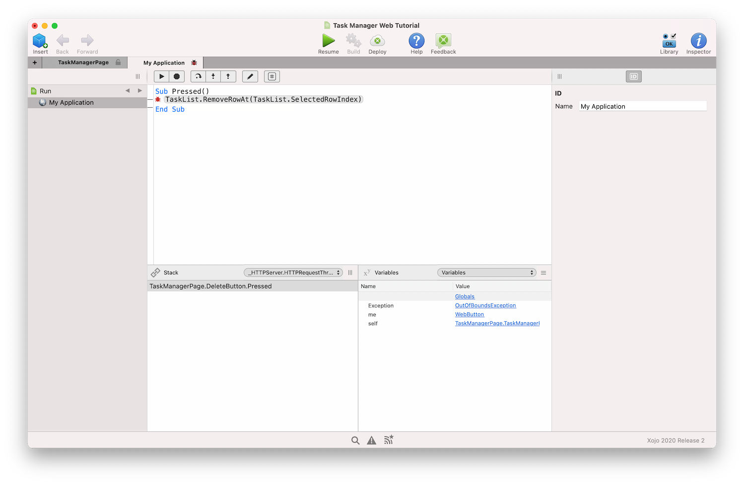 Switch back to Xojo and click the Stop button in the toolbar to return to the Code Editor. Luckily, it is easy to prevent this bug from occurring. We are just going to prevent the user from even pressing the Delete button if they don't have a row selected. That way SelectedRowIndex can never be out of bounds.