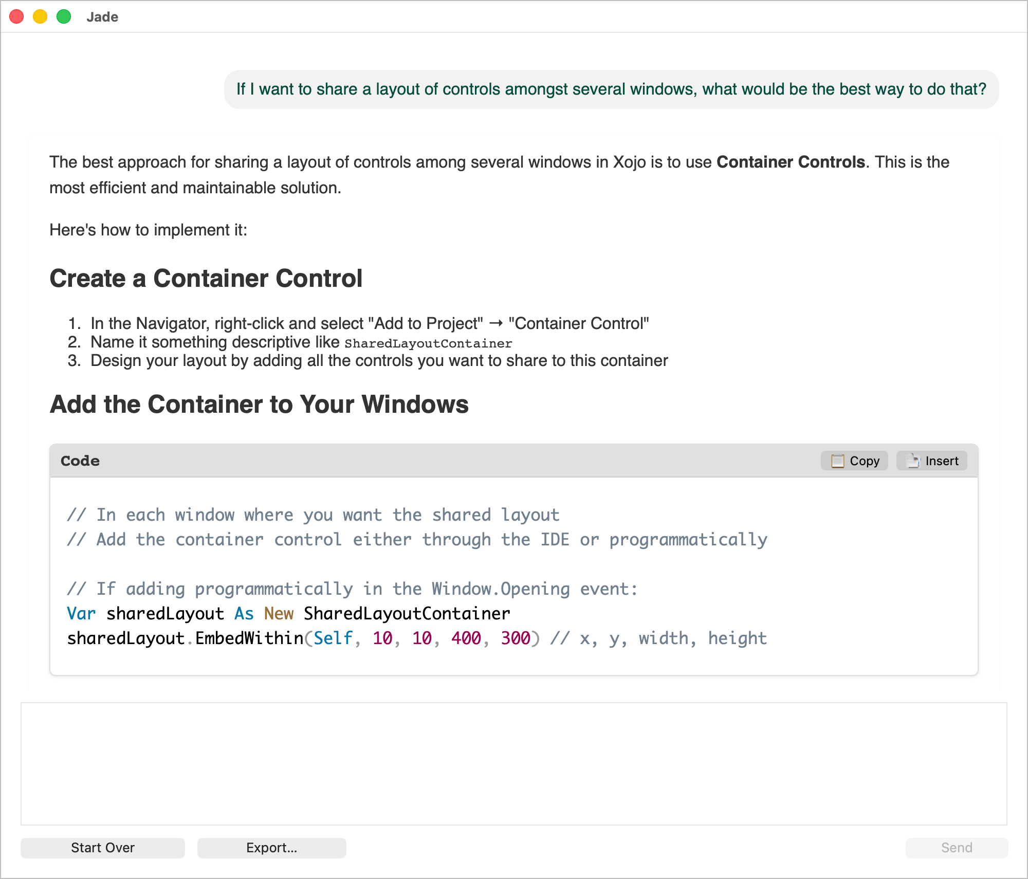 Jade can write code for you. When you ask, Jade will put the code in a Code pane inside the Jade window. At the top of the pane are two buttons: Copy and Insert. Copy will copy the code to the clipboard. Insert will insert the code into whatever method is currently selected in the Xojo IDE. If no method is selected, Jade will do nothing. Jade only copies the contents of the method. You will need to name the method and copy over the parameters yourself. This is temporary. Jade will continue to improve in future releases of Xojo, doing more and more automatically.
