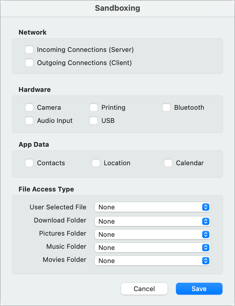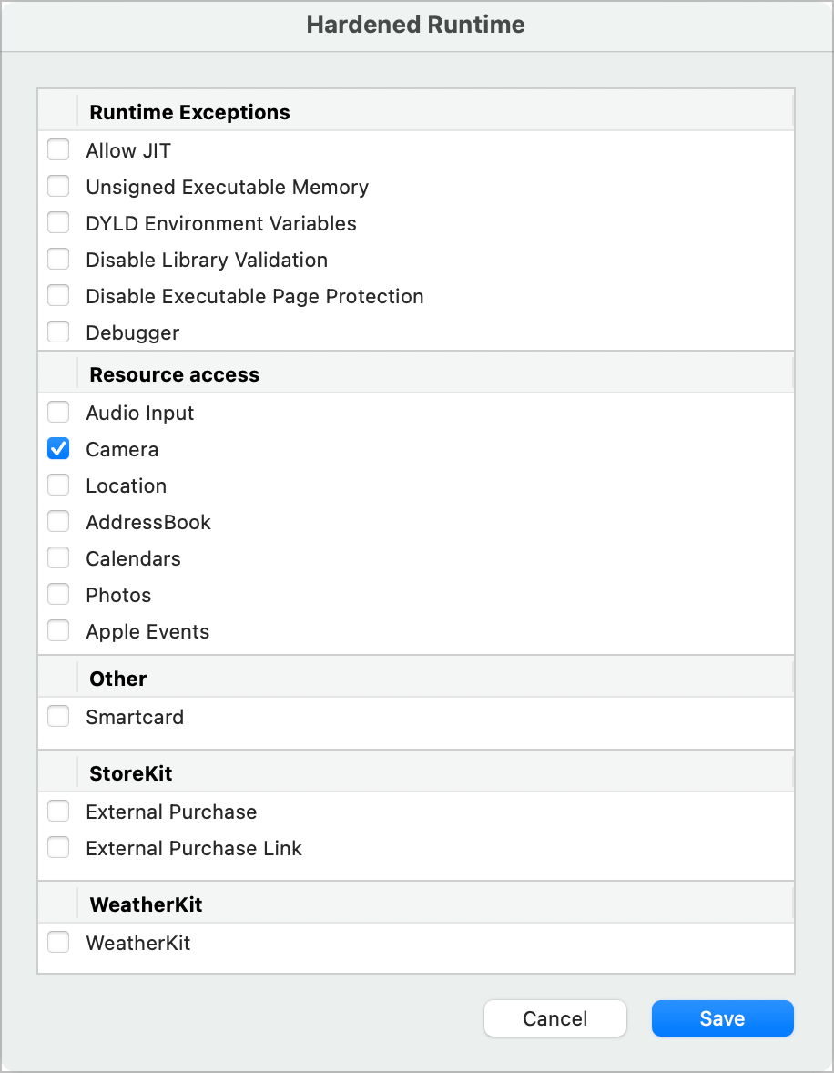 Click the checkboxes for anything that your app may require. It's rare that you will need to select any of these but you need the Hardened Runtime option turned on so that macOS will prevent malware from attempting to access your app through these external access points.