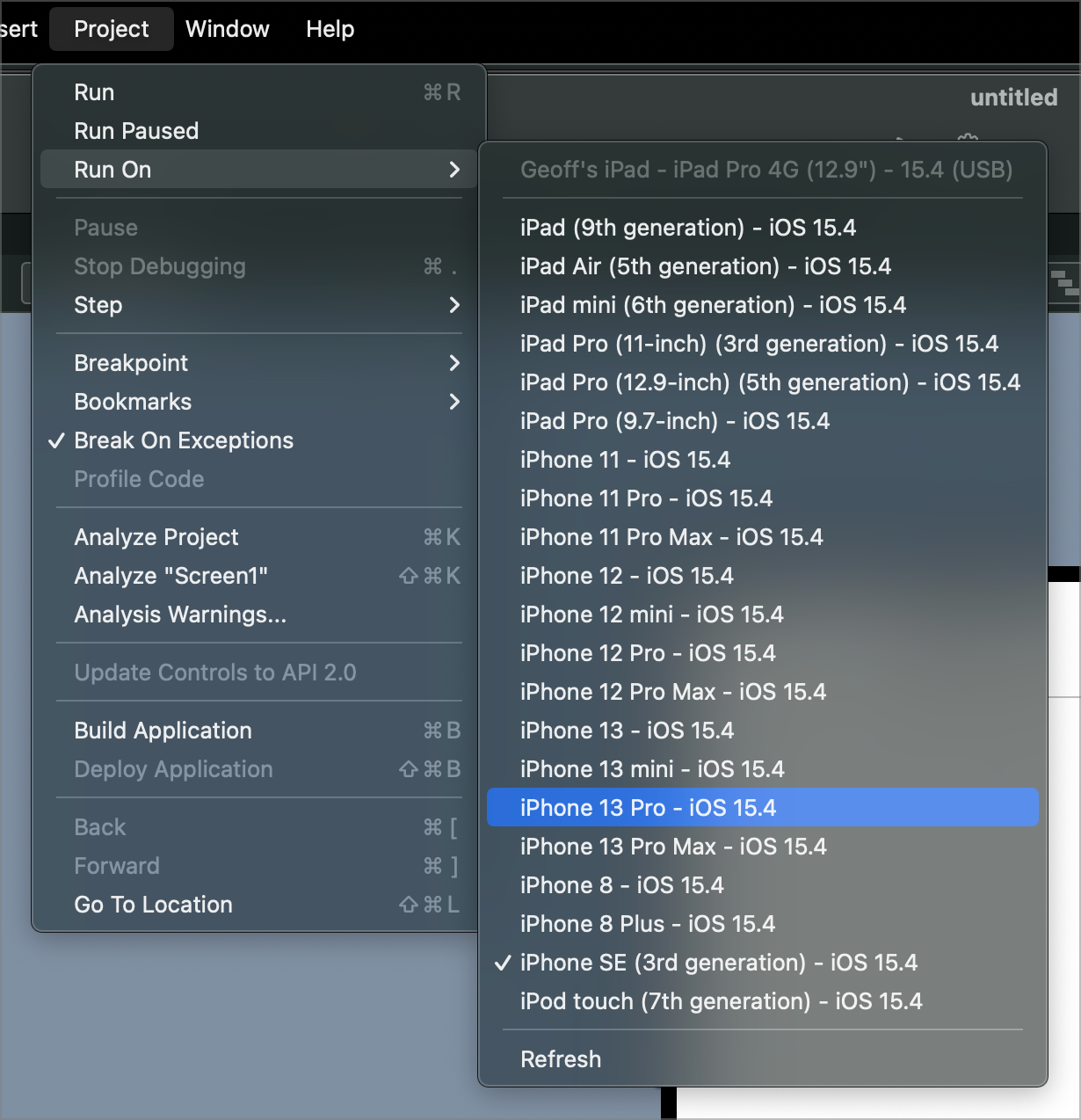 Once you've set up all of that, in Xojo choose Project > Run On then choose a device from the menu. If you have a device plugged into your Mac, you can run directly on it.
