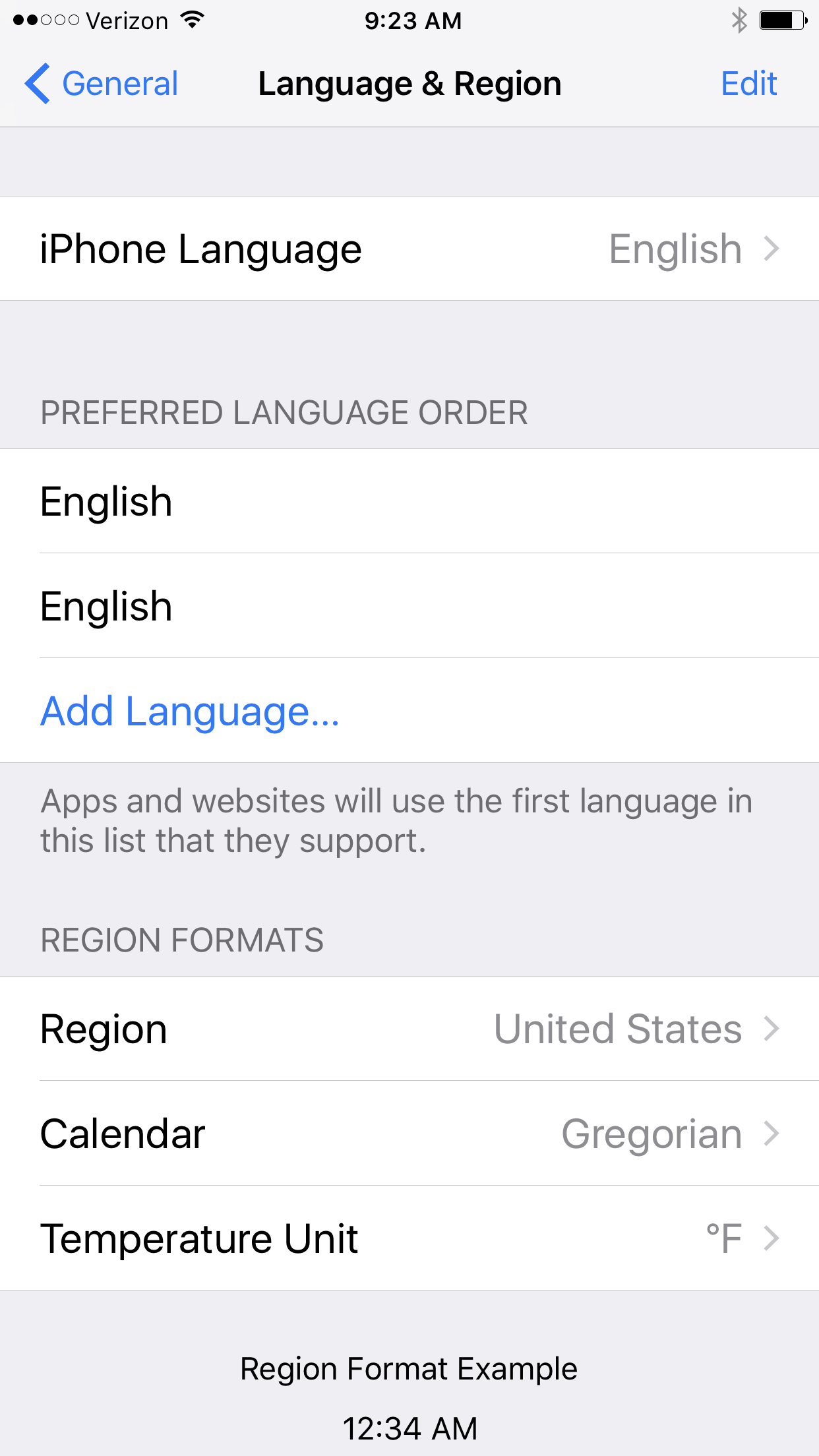 To change the language on iOS, open the Settings app and select General > Language & Region. On this screen you can change the preferred language order and region formats.